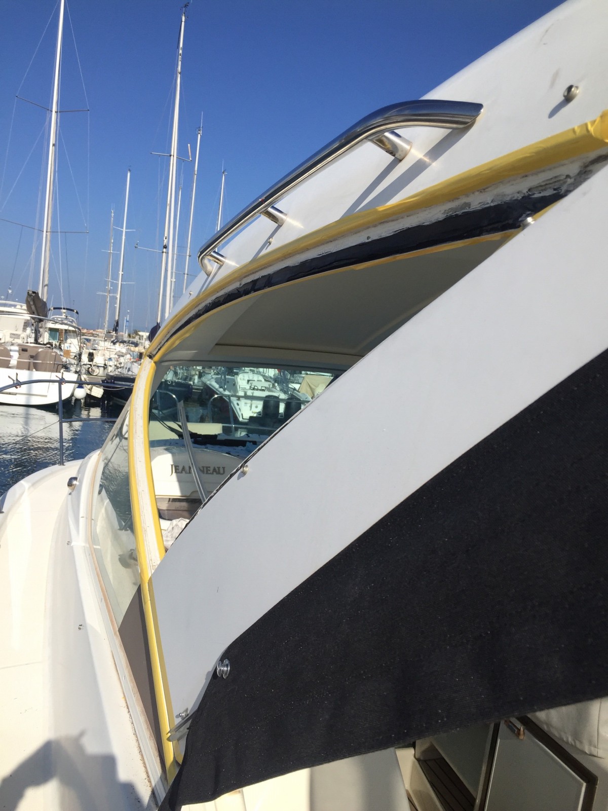 Nous réalisons Tout Travaux sur Plexi comme ici le collage d’une vitre tombée après une sortie en mer.