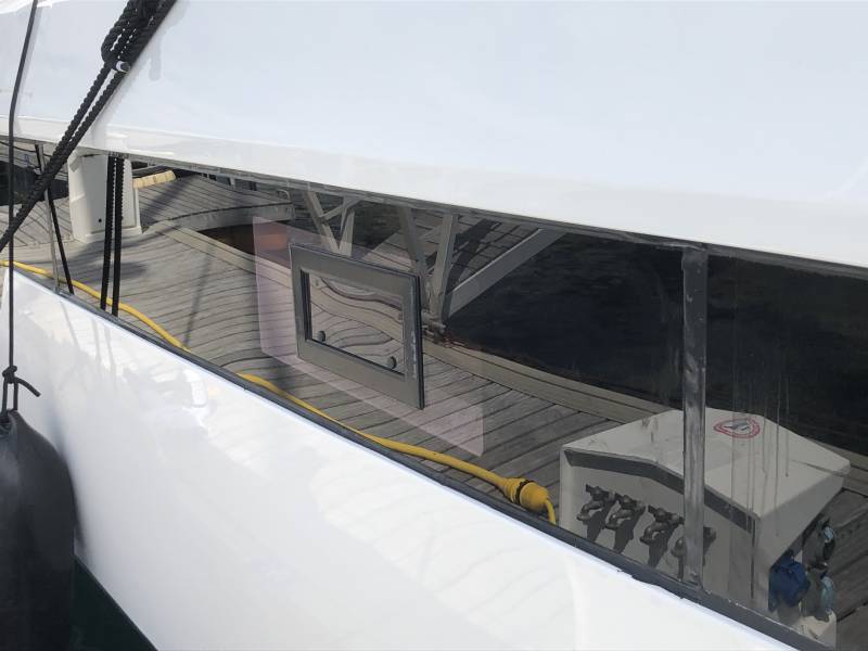 La société Plexi Boat basé au Cannet 06110 , à réaliser la fabrication ainsi que la pose d'une vitre latéral basse avec hublot en Plexiglass Pmma coulé gris fumée en 12/15 mm.