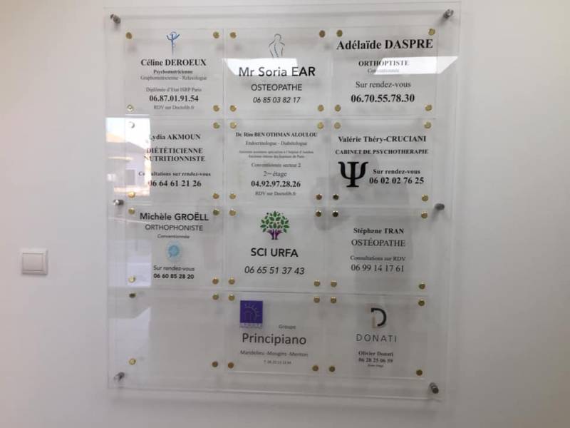 Nous avons réalisé des plaques plexiglas pour un cabinet médical sur Mandelieu la Napoule. Ostéopathe, Orthophoniste, nutritionniste, chaque professionnel à son nom gravé sur les plaques.