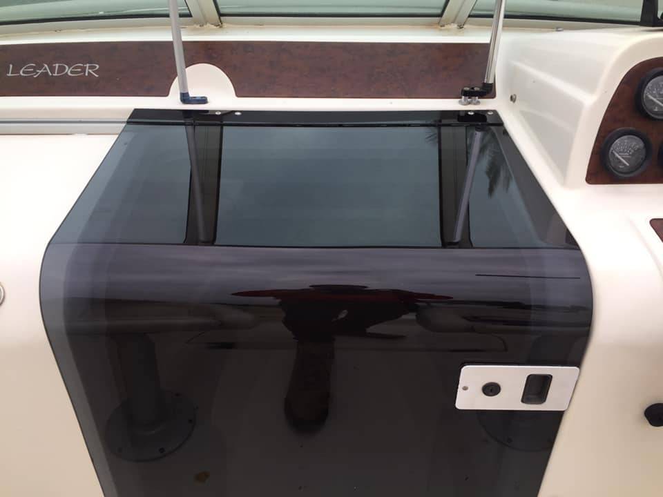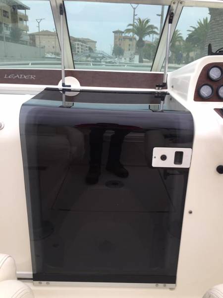 Suite a la casse de la porte nous avons démonté la porte puis réalisé un moule sur mesure. Apres avoir sélectionné la couleur avec le client . on avons ensuite moulé a chaud. Apres le refroidissement du plexi glass nous découpons la porte a l'identique. Pour un résultat optimale nous polissons tous les bord. l'ensemble des fixations d'origine sont conservés et refixés ainsi que les joints. Apres avoir nettoyer les rails de coulissement et la structure du bateau nous avons reposé la porte en utilisant du Sika de couleur adapté 295 UV.