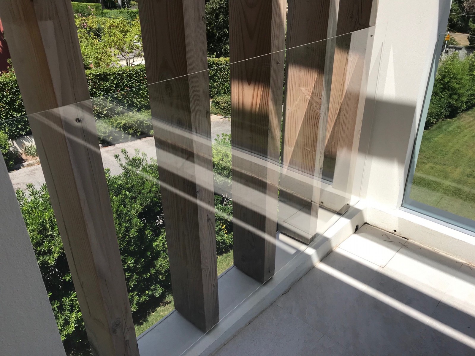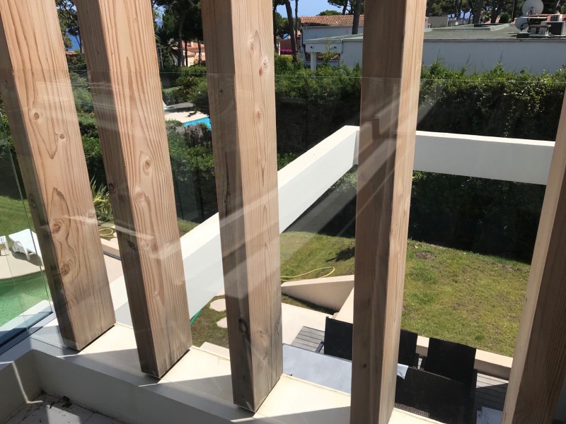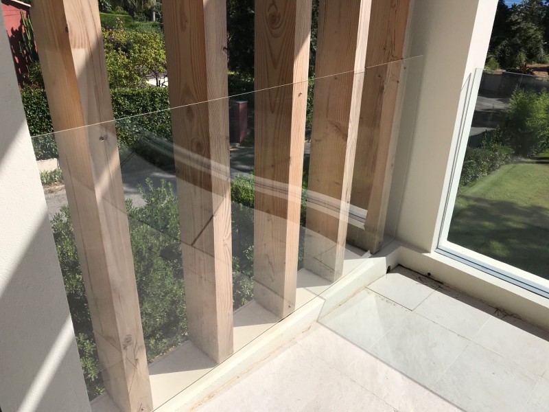 Ici la protection est faite en Plexi incolore de 6 mm soutenue par les poutres en bois .